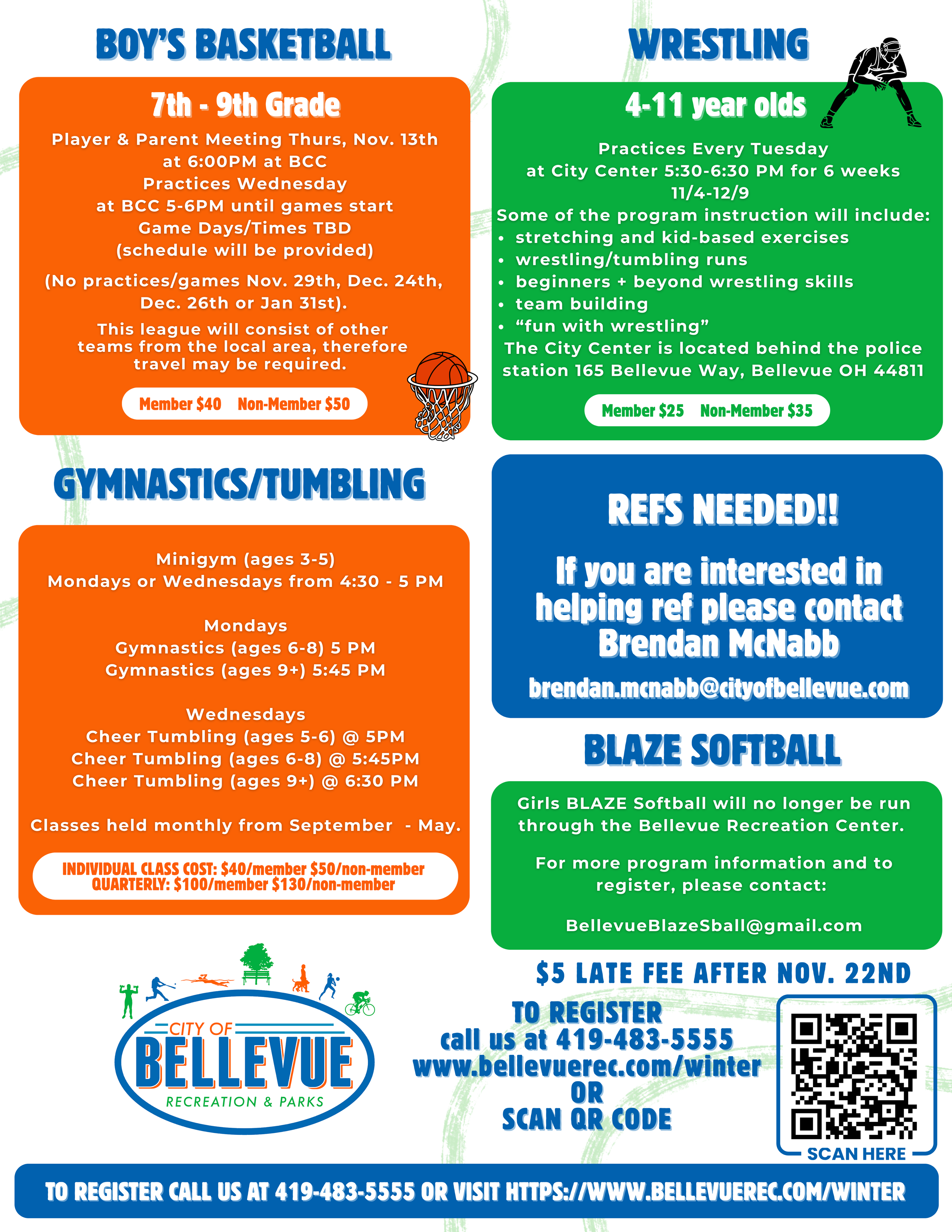 Register in person at Bellevue Community Center, 110 Cherry Blvd., Bellevue, OH 44811, call 419-483-5555, or visit bellevuerec.com.
